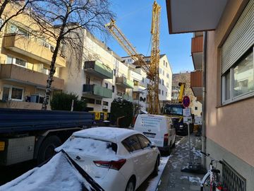 Die Tiefgarage erhielt obenauf eine neue Schwarzabdichtung und eine im Kiesbett verlegte Plattenlage. Die für diese Tiefgaragensanierung benötigten Materialien sowie der Bagger konnten nur mit einem Kran, den wir aufgestellt hatten, über das Haus gehoben werden.